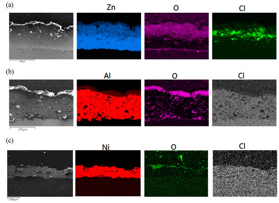 Cross-sectional EDS image of the (a) ZnAl, (b) Al and (c) Inconel 625 coatings after 1000 h of immersion corrosion.
