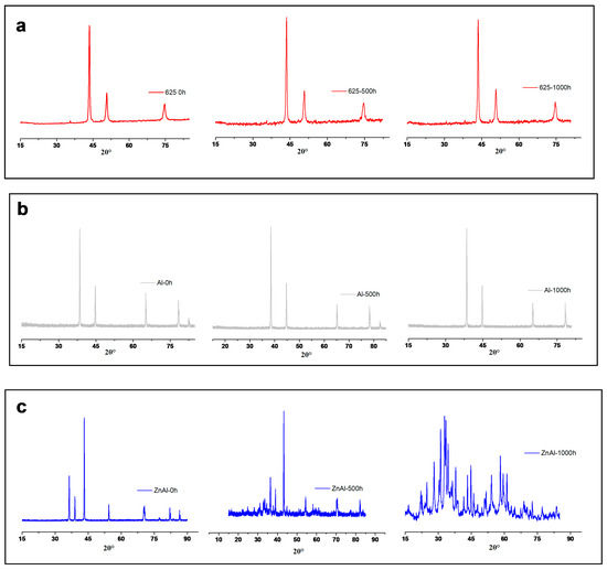 Figure 6a shows the Inconel 625 layers during the corrosion tests at 0–1000 h. The Inconel 625 alloy coatings maintain the best crystalline among the three types. The Al coating experienced the long-term immersion corrosion test, as shown in Figure 6b. After the long-term corrosion in the 3.5 wt % aqueous NaCl, the crystal structures were notably different from the coating surfaces for ZnAl. The ZnAl coating layers indicate the complexity of the oxide phases, as shown in Figure 6c. The ZnO crystalline phases are found at 33.5° (002), 48.0° (102), 56.8° (110), 64.3° (200), 68.0° (202), and 72.3° (230). However, the Al2O3 crystalline is not clearly identified. Furthermore, many unfitted peaks are shown. Thus, there are more chemical reactions on the ZnAl coatings that we do not understand for the ZnAl thermal coating surface.