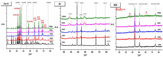 XRD spectra of the crystalline phases of the Al–Arc, ZnAl–Arc, and Inconel 625 alloy coatings.