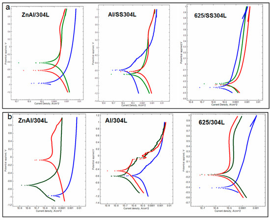 Tafel plots for the thermal spray coatings after: (a) NaCl deposition with controlled environmental corrosion; and (b) the immersion corrosion test in 3.5 wt % aqueous NaCl solution. The blue, green, and red lines are for 0, 500, and 1000 h, respectively.