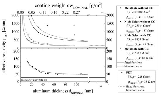 Even for the thicker coatings, the minimum resistivity ρOFFSET would not achieve literature values for bulk aluminum ρlit. This can partially be explained as material properties are influenced by the PVD process conditions. Such process conditions include the residual oxygen and water vapor pressures, the kinetic energy of evaporated aluminum atoms, and the mean free path length. However, obviously a second factor affects the values, because the minimum resistivity ρOFFSET increases with substrate roughness (Equation (9)). This can be explained; as a low roughness leads to small defects which can easily become overgrown with aluminum. In comparison, defects on very rough papers are too large to become overgrown, thus increasing the resistance R and minimum resistivity ρOFFSET.