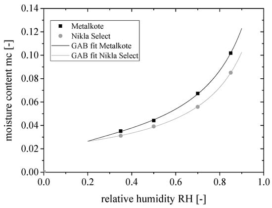 The relationship between mc and RH for the two paper samples is shown in Figure 9. Within the range 35%–90% RH, the curves were fitted to the GAB Equation (6). The fitted parameters for the GAB equation are shown in Table 1.