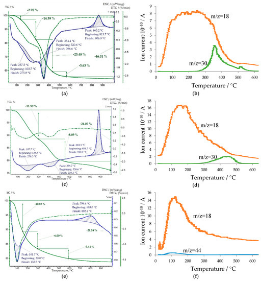 TG-DSC and MS analyses results of samples: S1 (a,b), S2 (c,d), S3 (e,f).