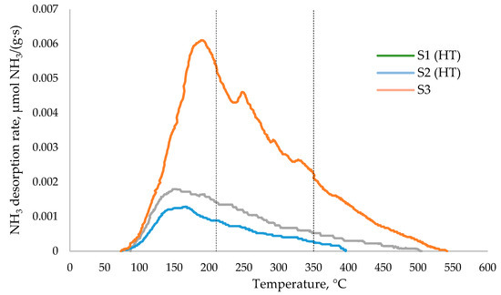 TPD-NH3 curves of all samples begin from the temperature of ~75 °C (Figure 5). Diffuse peaks are noted to the dependences of the ammonia desorption rate on the temperature of S1HT and S2HT samples in the region of ~140–190 °C. An intensive peak is noted on the curve of S3. These peaks are characterized by weak a.s. In the area of medium a.s. of S1HT and S2HT samples, the ammonia desorption rate with increasing temperature decreases slowly, while the desorption rate on the S3 curve increases with a peak at the temperature of 235–250 °C. In the field of strong a.s., an equable decrease in the desorption rate to 400, 500, and 540 °C occurs for samples S1HT, S2HT, and S3, respectively.