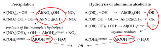 On an industrial scale, γ-Al2O3 is predominantly produced by the thermal decomposition of pseudoboehmite (PB). There are many methods for the synthesis of PB, for example, a hydrothermal treatment of gibbsite or alumina, a precipitation from solution salts under hydrothermal conditions [8,9], and others. However, the most common methods of PB obtaining are the hydrolysis of aluminum alkoholates [10] and the precipitation of aluminum hydroxide from Al-containing acidic solutions by a base [11]. These methods allow for controlling the phase composition and physicochemical properties of the obtained aluminum hydroxides. In both cases, the formation of amorphous compounds is observed in addition to the target product due to the forming of incomplete hydrolysis products in the first case and the organic residues in the second case, in accordance with Scheme 1.