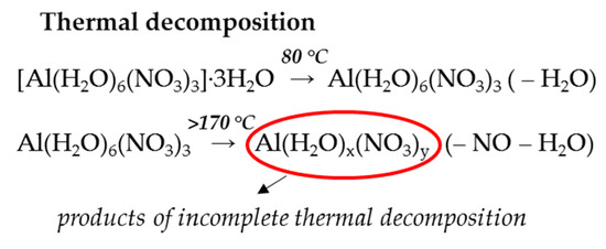 There are several ways to obtain the amorphous aluminum compounds: a calcination of the aluminum salts [7], the hydrolysis of the aluminum alcoholates [15], and the precipitation from Al-containing solutions by the base [7,16]. As a result, various non-crystalline aluminum compounds are formed differing in a phase composition and the physicochemical properties of surface. High-purity amorphous aluminum hydroxide containing the organic residues is obtained by the hydrolysis of organoaluminum compound. The residues of salts precursor are also presented in the structure of amorphous compounds that are formed by the precipitation and the thermal decomposition of aluminum salts, for example, nitrate, according to the Scheme 2.