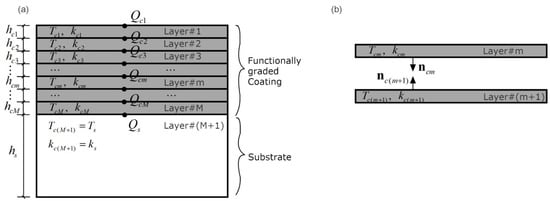 where kcm is thermal conductivity of the mth layer, Tcm denotes the temperature in the mth layer and M is the number of homogeneous sublayers in the functionally graded coating domain, as shown in Figure 2. Note that in Equation (6), the (M + 1)th layer refers to the substrate domain and kc(M+1) = ks, Tc(M+1) = Ts, Ωc(M+1) = Ωs.