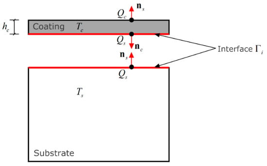 Obviously, the two governing equations defined in Equation (1) are independent of each other, owing to the material difference in thermal conductivity. To couple them, the temperature and normal heat flux continuous conditions at the interface Γi of the coating and substrate should be added for representing local thermal equilibrium: