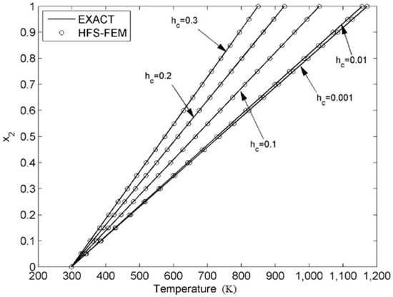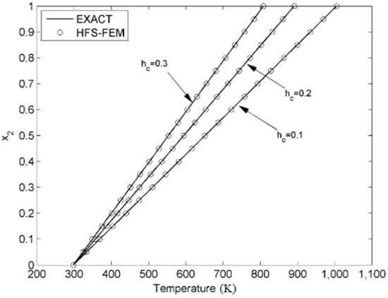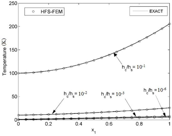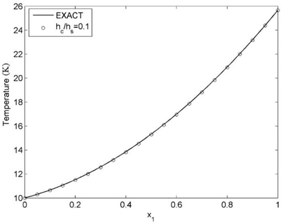 Firstly, we take η = 10 in Equation (36) such that the analytical temperature distribution is independent of the thickness ratio hc/hs. Results at three different points the same as those in the first test are listed in Table 2, from which it is found that the accuracy of numerical results begins to slightly decrease as the thickness ratio drops below 10−2, and the relative error to the analytical solution at the interfacial point A is the largest (0.32%), compared to that at the interior points B and C, i.e., 0.21% at the point B and 0.05% at the point C. It is reasonable that the points B and C are far away from the interface on which the approximated transfer boundary conditions are applied. Besides, Figure 6 shows the variation of temperature along the interface and we observe that, although the temperature changes nonlinearly in terms of the coordinate x1, the numerical results calculated by the present method are in good agreement with the exact solutions.