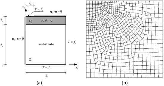 A substrate with a partially heated homogeneous thin coating is considered in the third test. The boundary conditions specified in Figure 8a are complicated enough to ensure two-dimensional heat transfer. The side length of the square substrate domain is 7 mm, and the local length of the specific extremely high temperature constraint is 1.75 mm. The related hybrid finite element mesh in the substrate domain is generated with 700 elements, as shown in Figure 8b.