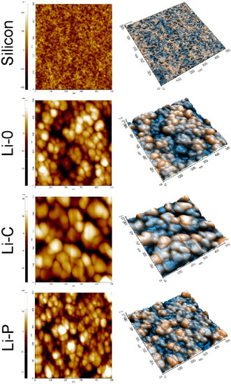Overall, based on the results, one should emphasize that the obtained lithium-based structures could be described as homogeneous and uniform, with a morphology that depends on the preparation route and with (average) roughness values in the nanometric range (Ra ~5–10 nm).