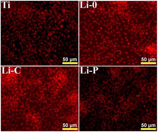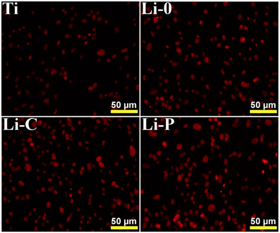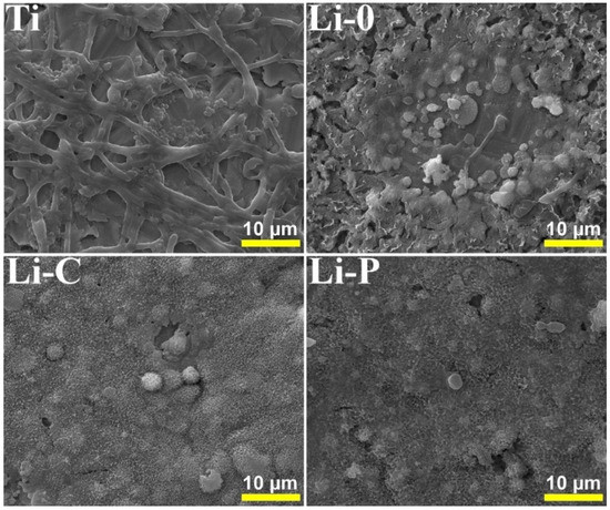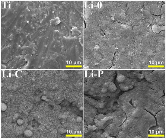 We note that results of anti-biofilm quantitative assays, which revealed a slightly superior anti-biofilm effect of Li-C and Li-P structures as compared to control Ti and Li-0 ones, are in good agreement with aspects recorded in SEM examination (Figure 12 and Figure 14). Presented SEM images were considered representative for the entire surface of samples and were selected after examining 8–10 different microscopic fields.