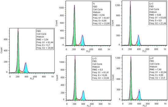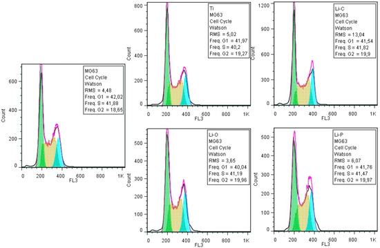 Flow cytometry diagrams of cells cycle analysis of MG-63 osteosarcoma cells grown on the tested materials.