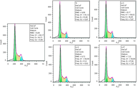 The cell cycle analysis by flow cytometry revealed that the obtained coatings did not influence the cellular cycle progression of the three type of cells (i.e., new initiated dermal fibroblasts, immortalized keratinocytes and MG-63 osteosarcoma cells) (Figure 8, Figure 9 and Figure 10), confirming that synthesized layers do not interfere with the typical development of normal and tumoral cells.