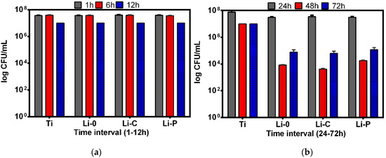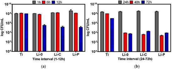 Regarding comparative efficiency of the tested materials, one can observe that Li-C coatings exhibited a slightly increased antimicrobial activity against S. aureus biofilm after 48 h of incubation, as compared to Li-0 and Li-P ones (Figure 11b).