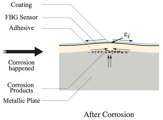 From Equation (1), it is known that the reduction at cathodes will change the iron into oxidized iron with size more than six times larger the original iron particles [46,47,48]. Thus, detecting the material volume or expansion change using the embedded FBG sensors in the coatings of steel components can potentially reveal the corrosion mechanism. When FBG sensors are embedded inside coatings on steel, the coating acts as constrains to the FBG sensor with an initial strain, ε0, introducing an initial Bragg wavelength, λ0. If no corrosion or damage, the Bragg wavelength will only vary with surrounding temperature. With a temperature reference FBG sensor on site, no Bragg wavelength change of the test sensor is expected, based on Equation (4). However, when corrosion occurs in the steel substrate, as shown in Figure 1, the corrosion products will push the coating up, inducing a strain on the FBG sensor, εi, that can be monitored by the Bragg wavelength change of the FBG sensors, λi, where i is the corrosion time step. If the corrosion production is accumulated within a relatively small area, as compared to the total span of the packaged FBG sensor and the expansion of corrosion productions that mainly occur in a vertical direction, the corrosion rate of the coated steel can be obtained through monitoring of the Bragg wavelength changes of the embedded FBG sensors as below [48]: