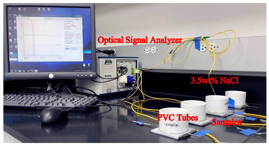 For accelerated corrosion tests with embedded FBG sensors, Figure 2 shows the test setup. To create a corrosive environment for accelerated corrosion, a PVC pipe with a diameter of two inches was fixed on top of the embedded sensors by Loctite heavy duty epoxy adhesive and filled with 3.5 wt % sodium chloride (NaCl) solution. The NaCl solutions were kept at room temperature (22 ± 3 °C) during the entire testing period. In addition to the test samples with embeeded sensors, an additional temperature compensation sample was made for both polymeric coating and wire arc sprayed Al-Zn coating to monitor the Bragg wavelength changes with tempeature variances. The Bragg wavelength changes from all the FBG sensors had been recorded using an optical signal analyzer (National Instruments PXIe-4844 Optical Sensor Interrogator integrated with PXIe-1071 Controller and PXIe-8133 Chassis, Austin, TX, USA) continuously during the testing period with a sampling frequency of 10 Hz. Visual inspections for all the samples were also scheduled at 12:00 p.m. daily to inspect the existence of corrosion on the surface of the samples.