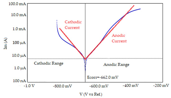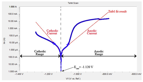 By fitting the linear part of Tafel plot graph, the Tafel constants, βA and βC, can be determined. With the polarization resistance (RP), which is determined by the material itself and the two Tafel constants, the corrosion rate can be calculated as follows [51]: