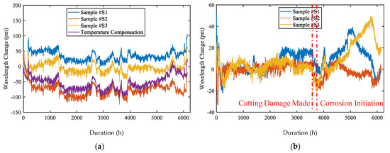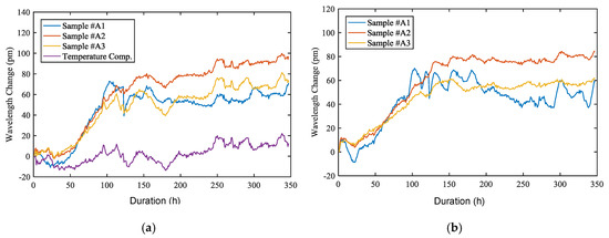 Bragg wavelength of embedded FBG sensors with wire arc sprayed Al-Zn coating vs. time (a) before temperature compensation and (b) after temperature compensation.