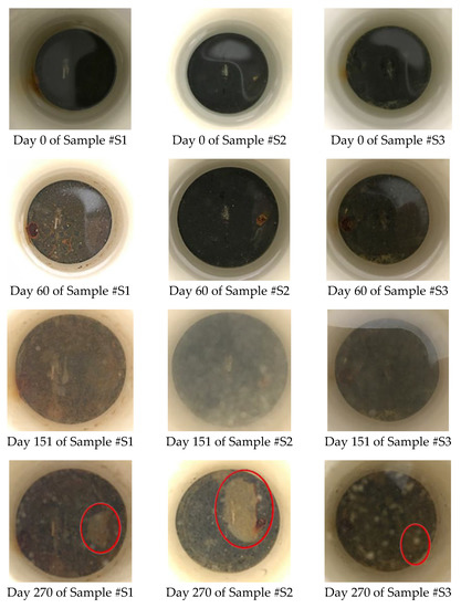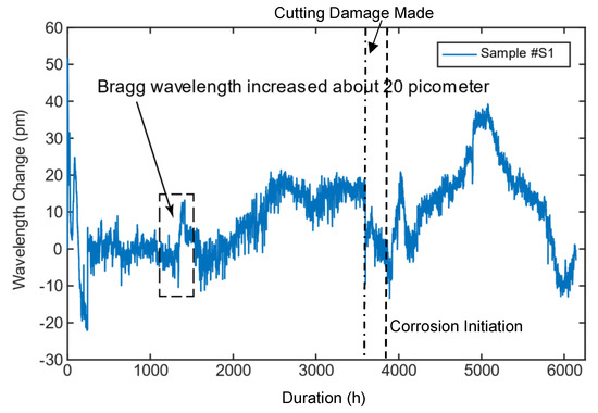 It was observed from visual inspection in Figure 7 that Sample #S1 had corrosion initiation before the cutting damage was made. This contributed to the 20 pico-meter increase in FBG sensor’s Bragg wavelength change of Sample #S1 started from about 1270 h (53 days), as shown in Figure 8. This may be induced by the fact that the PVC pipe was attached using a different type of epoxy before the epoxy coating was fully cured, causing the coating delaminated from the substrate.