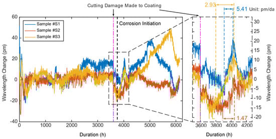 By taking a closer look at the Bragg wavelength change curve of the three sensors together, as seen in Figure 9, it was found that when the cutting damages were intentionally made to the epoxy coatings, the Bragg wavelength drop dramatically, indicating damage initialization. After the initial Bragg wavelength drop, it was followed by a rapid increase, similar to the corrosion initiation pattern. This rapid increase suggested that once the epoxy coating had been damaged, the bare steel had been exposed to the corrosive 3.5 wt % NaCl solution, and corrosion started to occur on the substrate.