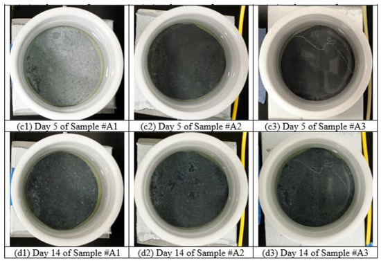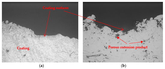 Figure 12 shows selected visual inspection results and Figure 13 compares the SEM images on the cross-section of the wire arc sprayed Al-Zn coating before and after accelerated corrosion tests. From Figure 12(b1–b3) for Samples #A1–A3, it can be clearly seen that after 48 h (Day 2), corrosion started to occur on the wire arc sprayed Al-Zn coating. Figure 12(c1–c3,d1–d3) indicates that after 120 h (Day 5) till 336 h (Day 14), the corrosion was very intensive and visible micro cracks started to form and penetrate through the coatings. The comparison of coating cross-section before and after corrosion in Figure 13 also illustrates that corrosion produced porous corrosion product on the surface of the coating after corrosion occurred.