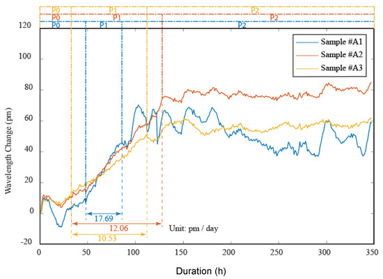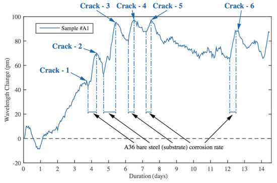 A close look at the changes of curves in Bragg wavelength of FBG sensors, as shown in Figure 14, as compared with visual inspection results in Figure 12, reveals that several inner coating cracks could be distinguished by the embedded sensor from 96 h (Day 4), as shown in Figure 15. After each crack, the Bragg wavelength of the FBG sensor firstly dropped for a short period, then increased rapidly, indicating an increase in corrosion rate, until a new crack was formed and then a new corrosion cycle started. Table 6 showed the corrosion rate of Sample #A1 before each coating crack. Table 6 showed that the corrosion rate was drastically increased after formation of cracks in the coating from 5.588 to 11.938 µm/year. Compared with the initial corrosion rate in Table 5, the fact that Table 6 showed a higher corrosion rate could be a combined corrosion progressing from the coating and its substrate after the occurrence of micro cracks.