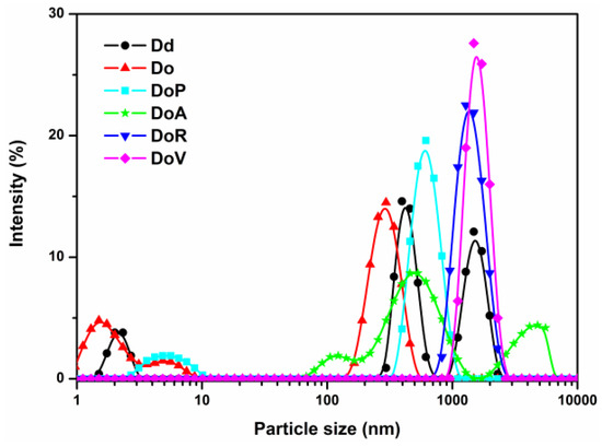 Particle size distributions of the sols without and with added SiO2 and TiO2 nanoparticles measured by DLS are shown in Figure 1. Sols without added nanoparticles (i.e., Dd, Do, DoP) are characterized by the particle sizes in the range 1–10 nm together with some proportion of larger ones 0.1–1 µm in size (maybe dust particles). The nanoparticle-containing sols are characterized by much larger particles 0.06–6 µm in size, which are clearly agglomerates of the primary nanoparticles. The degree of agglomeration seems to depend on the nature of particles added. DoR and DoV exhibit similar particle size distributions in the range from 1 to 2 µm. They do not practically contain any substantially smaller particles. The particle size distribution of DoA containing hydrophilic silica NPs markedly differs, being characterized by a very broad range of particle size from 70 nm to several micrometers. Three distinct maxima were observed for this sample, centered at about 120, 500, and 5000 nm.