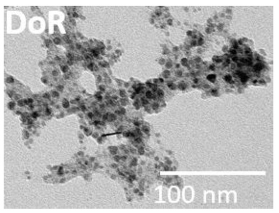 The TEM image of DoR, Figure 2, containing octylated nanoparticles, clearly shows the presence of these nanoparticles which are less than 10 nm in size and exhibit a higher electron density than the sol-gel material around them, which is in accordance with previous works [16,23]. These small nanoparticles are bound into irregularly shaped agglomerates. Generally, the data obtained by DLS and TEM are difficult to compare as the samples change in time and are exposed to different conditions—in sol for DLS and in solid state after the vaporization of the solvent for TEM.