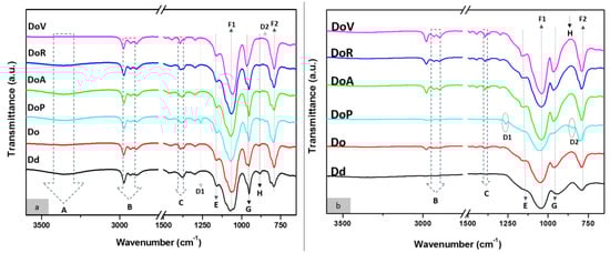 In order to compare the chemical bonds formed, the sols and powders were analyzed by ATR FTIR spectroscopy [24,25] (Figure 3a,b). As the materials are chemically the same, the sols (Figure 3a) show similar spectra. Owing to the presence of alkyl groups either bonded to the siloxane skeleton or in the solvent, a number of bands were observed (designated as B, C, D, E, H). In the range from 3000 to 2800 cm−1, three bands (B) correspond to the stretching of carbon–hydrogen (C–H) bonds of alkyl chains [26]. The bands in the range from 1480 to 1385 cm−1 (C) are due to the stretching of carbon–hydrogen (C–H) bonds of the alkyl chain, i.e., in the -CH3 and -CH2- groups. Band at 1162 cm−1 (E) corresponds to CH3–(C), those at 1255 and 850 cm−1 (D1 and D2) to -CH3 bending and rocking in -Si(CH3)3, which is the end group of the PDMS chain. The band at 889 cm−1 (H) is due to the deformation of CH3 and CH2 groups of the isopropanol molecule.