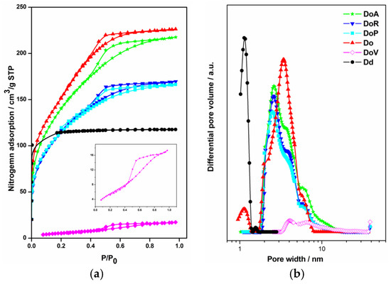 The pore size distribution of the xerogels was obtained by the Non-Local Density Functional Theory (NLDFT) method (Figure 4b, Table 3). The pore size distribution for the sample Dd is centered at about 1 nm, which is in agreement with its microporous nature. All xerogels synthesized with n-octylamine show pores in the mesoporous range. The samples DoP, DoA, and DoR exhibit similar pore size distributions centered at 2.4 nm with a saddle at 3.2 nm. The sample Do exhibits uniform pore size distribution with a maximum at 3.2 nm. Finally, the pores of the DoV sample with a much smaller surface area and pore volume are larger with maxima at 3.5 and about 7 nm.