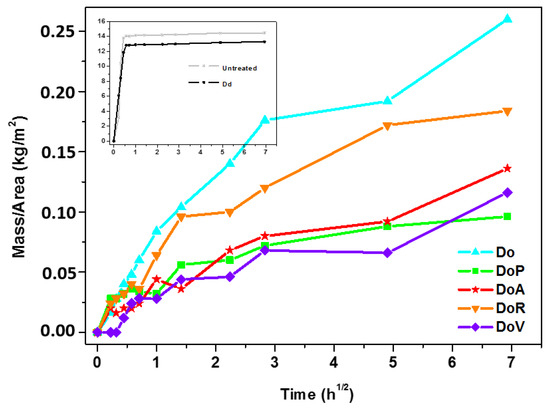 The water absorption by capillarity (WAC) is presented in Figure 7. For the untreated stone, the inset shows a very fast increase in the mass of the absorbed water within the first hour, followed by a practically horizontal plateau. For the comparative sample Dd, the mass of absorbed water is only slightly lower because of substantial disintegration of the consolidant xerogels in the stone pores (Figure 5b). However, for consolidants catalyzed by octylamine, the water absorption is drastically reduced, practically by two orders of magnitude. The products with PDMS or R805 (DoP or DoR) are the most effective in decreasing water absorption, confirming their hydrophobic properties. For the stone treated with the consolidant Dd, the decrease in water absorption by capillarity was only about 7%, but for all the samples treated with the novel consolidants it reached 98%–99%.