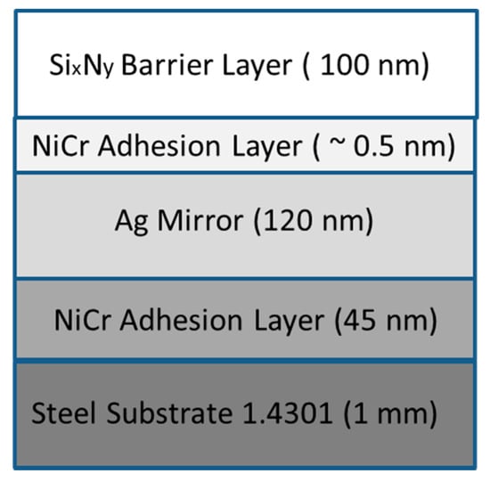 The protected silver layer system was deposited also on polished 1 mm 1.4301 steel substrates. The protected sputtered silver system was NiCr (45 nm)/Ag (120 nm)/NiCr (0.5 nm)/SixNy (100 nm) and is shown in Figure 1. The SixNy barrier and NiCr adhesion layers were sputtered in sequence with the silver films. The bottom NiCr layer was as described above. The top NiCr layer used a standard DC planar magnetron (target Ni:Cr 80:20 wt %) with a power of 0.8 W/cm2 in an Ar atmosphere of pressure 0.09 Pa. The SixNy was deposited using a middle frequency, MF, dual rotary cathode (target Si:Al 90:10 wt %) at 10.8 W/cm2 in an Ar/N2 (gas flow rate ratio 1:1) at a pressure of 0.3 Pa. The top adhesion was a nominal 0.5 nm NiCr designed to maximize the Ag-to-barrier layer adhesion with minimal reflectance degradation.