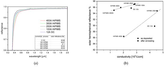 The reflectance spectra of the as-deposited discrete 500 nm silver films on glass substrates are presented in Figure 2a. The solar reflectance increased to a maximum for the silver films deposited with 200 A in HiPIMS mode, but for higher HiPIMS currents it decreased and, indeed, with 400 A HiPIMS it was lower than the 12 A DC MS-deposited silver film. In Figure 2b, the conductivity of the films is plotted against the global solar hemispherical reflectance. The films sputtered by HiPIMS exhibit an approximately linear relationship whereby the conductivity proportionally increases with increasing reflectance. The 12 A DC MS samples are sputtered in a different mode and exhibit a higher conductivity-to-reflectance ratio than the HiPIMS films.