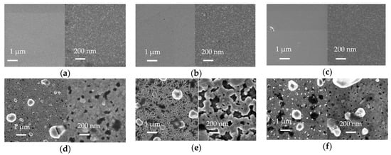Scanning electron microscopy (SEM) pictures. Each picture pair is from the same sample, the one on the right being of higher magnification than the one on the left. The scale is given in (a). (a–c) The upper pictures show the films as deposited after sputtering, whilst (d–f) shows pictures post 8 h anneal at 400 °C; (a,d) shows the 12 A direct current magnetron sputtering (DC MS) silver; (b,e) shows the 200 A HiPIMS silver; and (c,f) shows the 400 A HiPIMS silver.