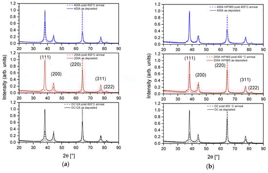 In Figure 4a, the GIXRD spectra for the 400 A HiPIMS, 200 A HiPIMS, and 12 A DC MS silver films deposited on NiCr coated glass substrates, as-deposited and after an 8 h anneal at 400 °C, are shown. As stated, the grain size, peak position and intensity were calculated or measured from the spectra, and for clarity and transparency they are given in Table S1 as supplementary material.