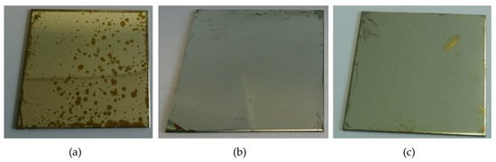 Photographs of 5 × 5 cm protected silver coated steel after end of testing in oven at 400 °C: (a) 12 A DC MS silver system exposed for 768 h, (b) HiPIMS 200 A silver-system exposed for 1800 h, and (c) 400 A HiPIMS silver system exposed for 384 h.