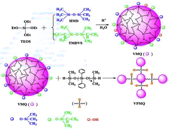 1H-NMR: The structure of the VMQ and VPMQs was characterized at 25 °C with an Av500 Hydrogen Nuclear Magnetic Resonance Spectrometer (Bruker, Germany) at a frequency of 500 MHz. Deuterated chloroform (CDCl3) was used as the solvent and tetramethylsilane (TMS) as an internal standard.