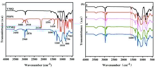 (a) Infrared spectra of VMQ, PDPS and VPMQ; (b) infrared spectra of VMQ and VPMQ series. (a–e) VMQ, VPMQ-1, VPMQ-2, VPMQ-3 and VPMQ-4, respectively.