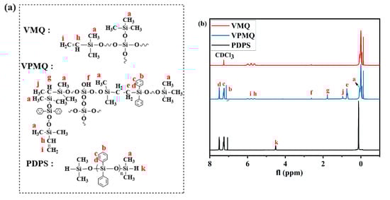 1H NMR spectrum of VMQ, VPMQ and PDPS: (a) Molecular formula of VMQ, VPMQ and PDPS; (b) 1H NMR spectrum of VMQ, VPMQ-4 and PDPS.