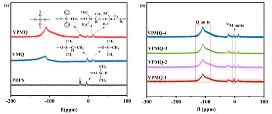 (a) 29Si NMR spectra of VMQ, VPMQ and PDPS. (b) 29Si NMR comparison of VPMQ samples.