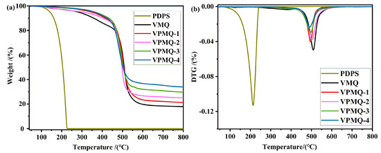 TG curves (a) and DTG (b) curves for VMQ and VPMQ series obtained under a nitrogen atmosphere.