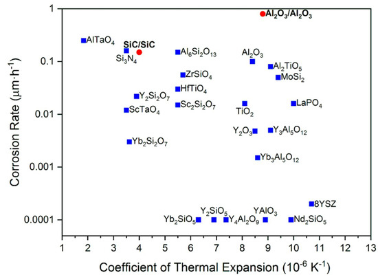 Corrosion rates and coefficient of thermal expansion of selected materials (blue boxes) and ceramic matrix composites (CMCs) (red circles) (data from references [5,7,18]).