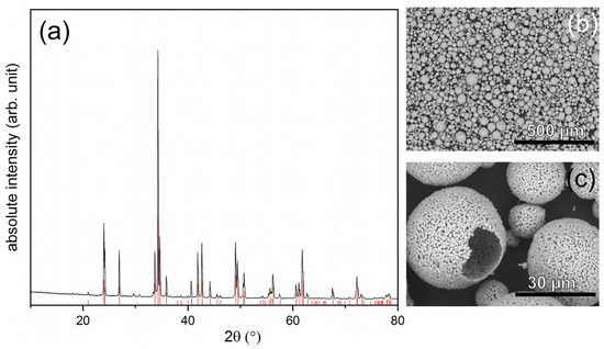 XRD measurement (a) and SEM images (b,c) of the used YAlO3 powder. The diffraction pattern of YAlO3 is shown in red.