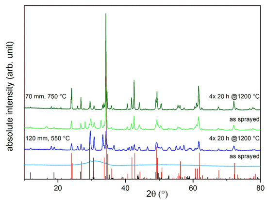 The YAlO3 coatings were produced using APS at varying stand-off distances and resulting different coating temperatures. The XRD-measurements of the APS YAlO3 coatings before and after thermal cycling are presented in Figure 3. The coating sprayed at higher stand-off distance and thus lower substrate temperature was amorphous in the as-sprayed state. The thermal cycling led to the crystallization of the coating. Phase analysis revealed the presence of YAlO3, Y3Al5O12, and Y4Al2O9. The refined phase content of the different phases is given in Table 2. Phase analysis showed that the three yttrium aluminates occurred in almost equal fractions.