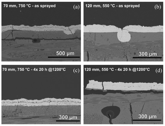 The coatings obtained at a smaller stand-off distance (70 mm) were already crystalline in the as-sprayed state. However, large pores were present in these coatings, especially at the interface between the different coating layers. Sporadic delamination was observed even in the as-sprayed state, and the coatings were prone to form segmentation cracks. Both cracks and pores have a negative effect on corrosion resistance, as they increase the permeability of the EBC to water vapor. Here, the segmentation cracks seemed to continue into the substrate, which could additionally affect the structural integrity of the material.