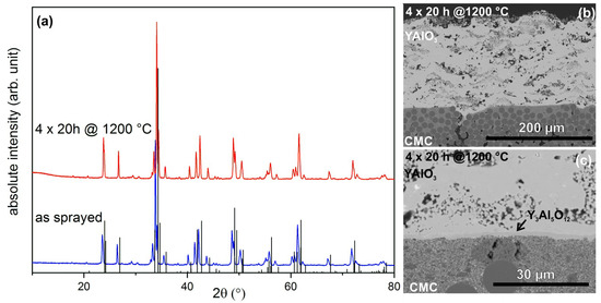 In the past, the production of plasma-sprayed yttrium aluminate coatings (YAG, Y3Al5O12) proved to be particularly challenging [23]. The challenging behavior of Y3Al5O12 may also be relevant for YAlO3 coatings. Nevertheless, YAlO3 is a promising EBC candidate. Therefore, plasma-sprayed YAlO3 coatings as EBC for an Al2O3-based CMC will be discussed in this study, paying special attention to the phase evolution during plasma spraying.