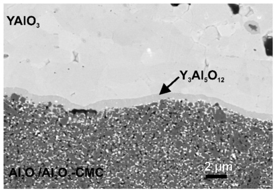 All of the above-mentioned coating strategies involve surface preparation by sandblasting, laser structuring, or even the application of a bond coat. Furthermore, the used coatings offer only moderate corrosion rates, but as Figure 1 suggests, there are materials with corrosion rates one or two orders of magnitude lower and with more suitable CTEs. An example is YAlO3 (YAP, yttrium aluminum perovskite), which has a very low corrosion rate and a CTE close to that of the used CMC material. Because of the great chemical similarity of YAlO3 and Y2O3 and according to the phase diagram [22], a reaction layer may be formed at the interface (Y3Al5O12, YAG, yttrium aluminum garnet). Studies on Y2O3 coatings [19] have shown that this reaction layer is very beneficial for coating adhesion. Therefore, coatings with good adhesion and long service life are expected. However, there are no studies yet on the suitability of YAlO3 either as TBC or as EBC.