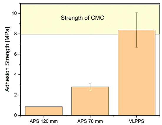 The coating adhesion was tested with pull–adhesion tests, and the results are illustrated in Figure 7. The adhesion of the APS coatings was very poor, and both coatings failed directly at the beginning of the test. High stresses in the coatings might be the reason for the bad coating adhesion. The adhesion of the VLPPS coatings was significantly higher. The measured strength was in the order of that of the CMC itself.