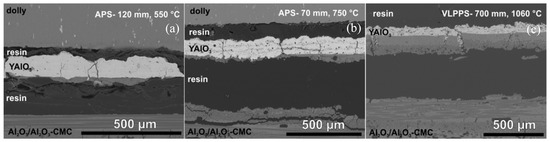 The samples were embedded and cut after adhesion testing. SEM images of the polished cross sections are shown in Figure 8. The high stresses in the APS coatings led to failure partly within the CMC and partly at the coating–substrate interface. It is assumed that slight reactions between coating and substrate or clamping occurred, which caused a partial failure within the matrix of the CMC.